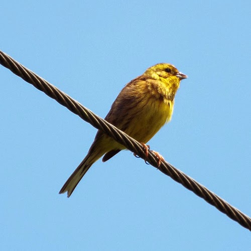 There are still plenty of warblers about and we heard Blackcap, Garden Warbler, Common Whitethroat, Lesser Whitethroat, Chiffchaff, Willow Warbler and Sedge Warbler. By the cottages there was a male Common Whitethroat letting every one know that this was his patch and as he flew from tree to tree and back up onto the telegraph wires he was joined momentarily by a Yellowhammer.