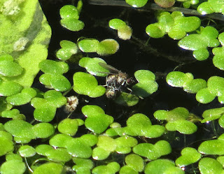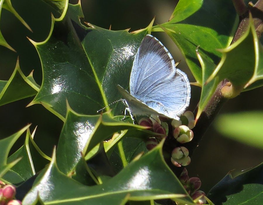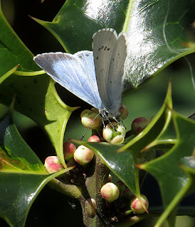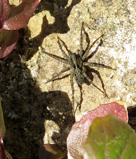 In the back garden today a Holly Blue, Large White and Peacock butterflies. On the pond two very small flies chasing each other around and on the rocks a spider which looks like a small Eratigena atrica